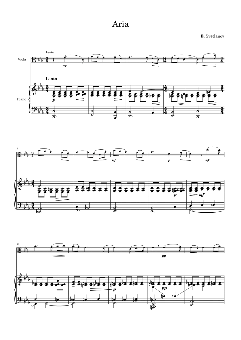 Composed in 1975 by Evgeny Svetlanov, the Aria for Viola and Piano (Ария для альта и фортепиано) is a lyrical chamber piece that reflects the composer’s intimate, expressive side as both pianist and composer. Unlike Svetlanov’s larger orchestral works, this aria adopts the character of a vocal-inspired instrumental piece, centered on the viola’s warm, singing quality supported by a sensitive piano part.